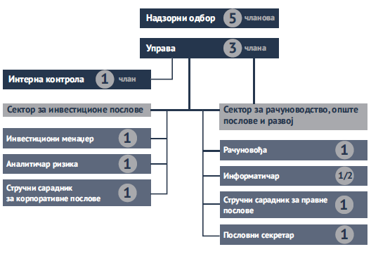Организациона и кадровска структура Друштва за управљање је одређена Правилником о унутрашњој организацији и систематизацији радних мјеста у Друштву. Тренутно је запослено 10 радника на пуно радно вријеме и један информатичар, који је у сладу са тренутним потребама Друштва запослен на пола радног времена.